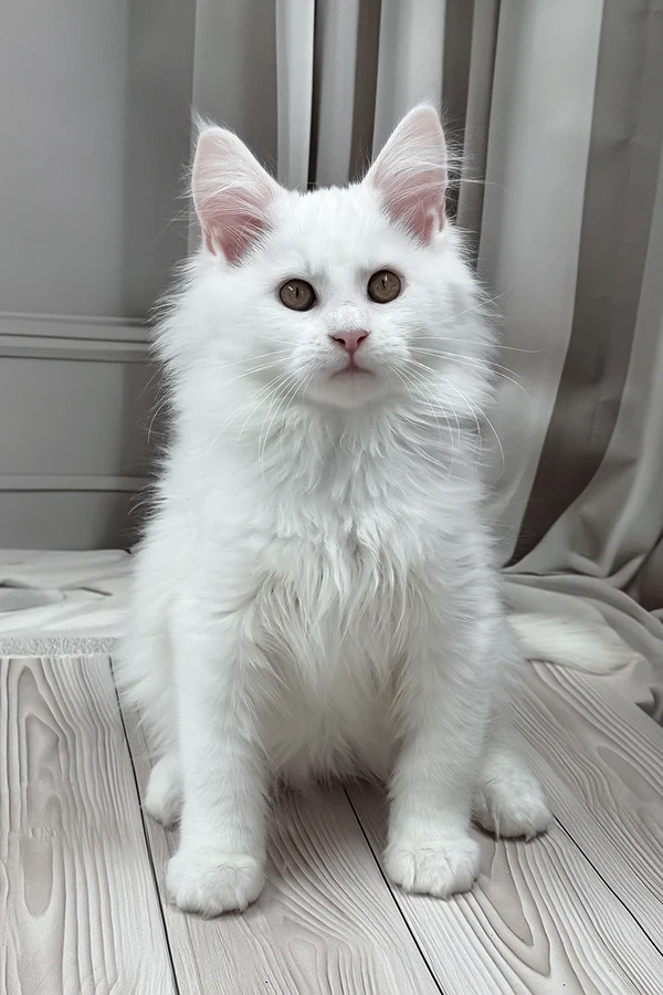 I am Elizabeth, a graceful 3-month-old female Maine Coon kitten with a pure white coat that feels as soft as snow and shines with a silky glow. My bright green eyes are full of calm intelligence and quiet affection I love gentle play, cozy spots, and brushing sessions that turn into soft purring moments. If you’ve dreamed of a green-eyed snow-white girl who follows softly from room to room and fills your days with quiet warmth, that’s me, waiting to belong.