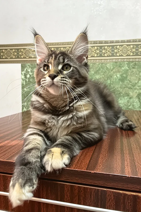 Hi! I’m Kawasaki, a 4-month-old Maine Coon girl with a black tortoise ticked tabby coat that shines in soft, silky waves. My bright yellow eyes hold a gentle glow, and my sturdy frame hints at the big, loving companion I’ll grow to be.