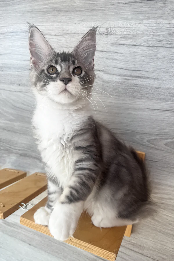 Hello! I’m Nina, a 3-month-old Maine Coon girl with a striking blue smoke blotched tabby bicolor coat and glowing yellow eyes that shine with warmth. I’m gentle, playful, and curious, making me the perfect mix of beauty and personality.